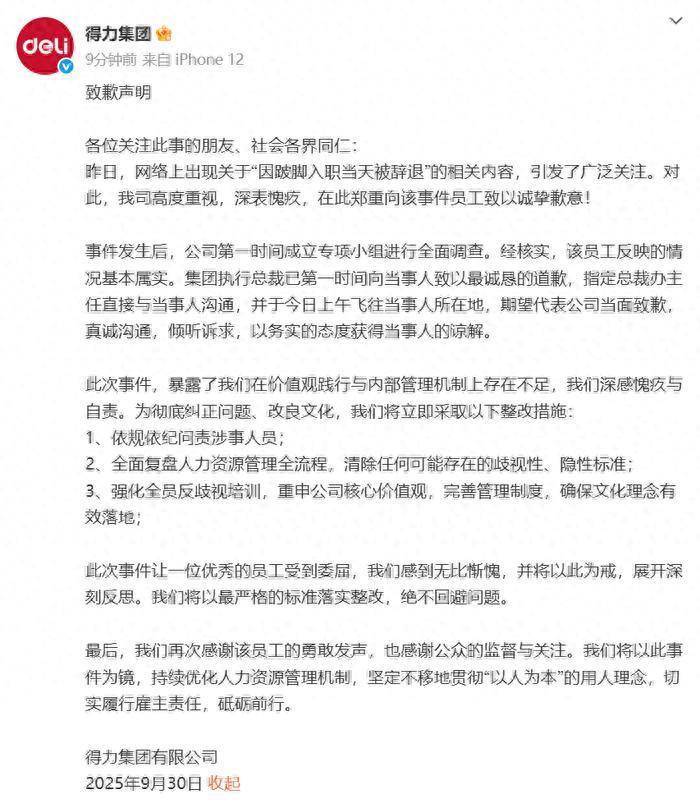 昨日,网络上出现关于“因跛脚入职当天被辞退”的相关内容,引发了广泛关注。对此,我司高度重视,深表愧疚,在此郑重向该事件员工致以诚挚歉意!